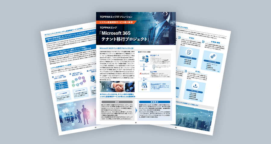 サービス導入事例弊社システム基盤構築サービスを活用した「Microsoft365テナント移行プロジェクト」の事例をご紹介。企業統合や事業統合における、社員データの大規模移行を検討中のお客さまには、大変参考になる事例となっています。ぜひ、ダウンロードしてご一読ください。